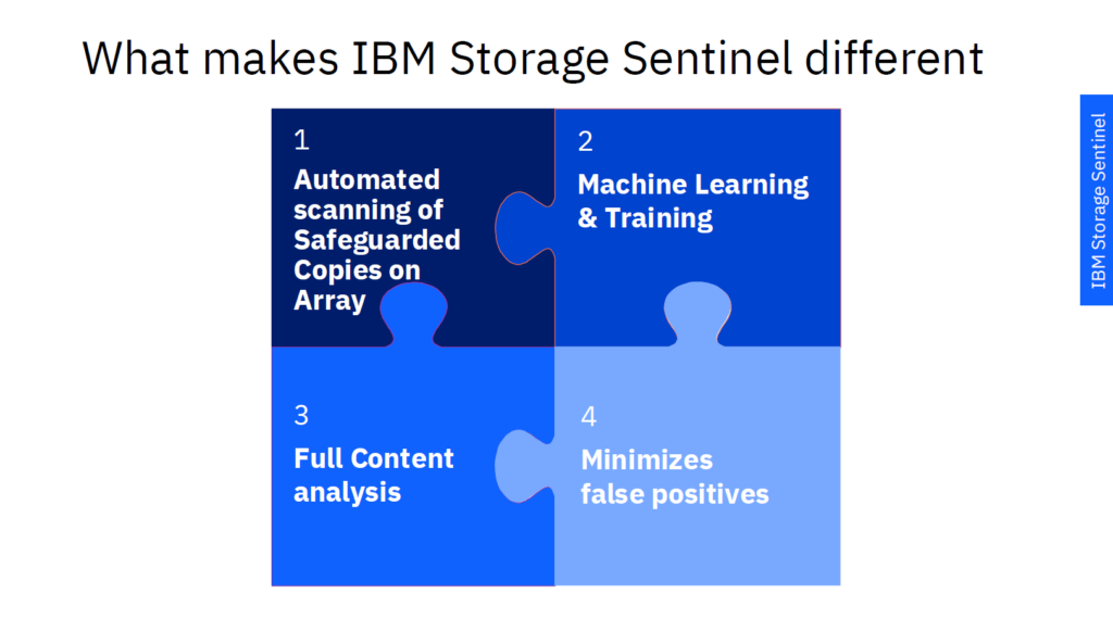 Among the highlighted solutions, IBM FlashSystem with Safeguarded Copy stands out, as it creates immutable and isolated copies for rapid restoration, preventing data alteration or deletion caused by human error or ransomware. This is complemented by advanced detection capabilities using Shannon Entropy, which identifies encryption patterns typical of malicious attacks. In addition, IBM Storage Sentinel leverages artificial intelligence to validate recovery points, detect data corruption, and reduce false positives, while IBM Storage Data Protect enables large-scale restorations—from a single file to thousands of virtual machines—in just minutes.