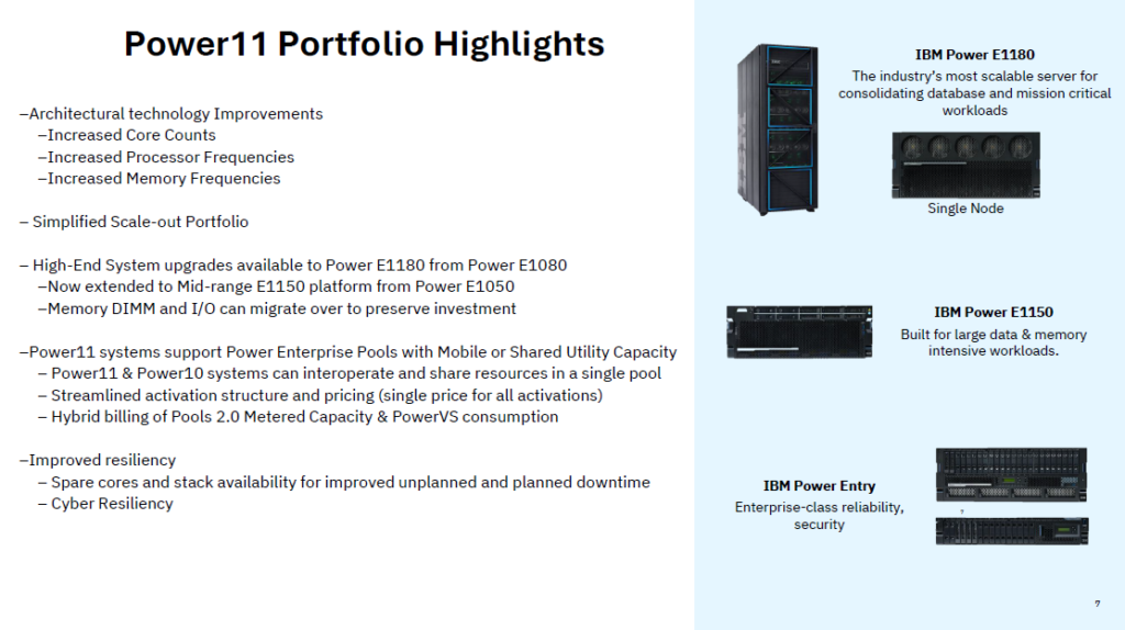 Power11 offers an Edge-to-Cloud platform with energy efficiency and AI acceleration planned for late 2025. Its architecture enhances processors, DDR4/DDR5 memory, and enables interoperability with Power10, ensuring seamless modernization and continuity.