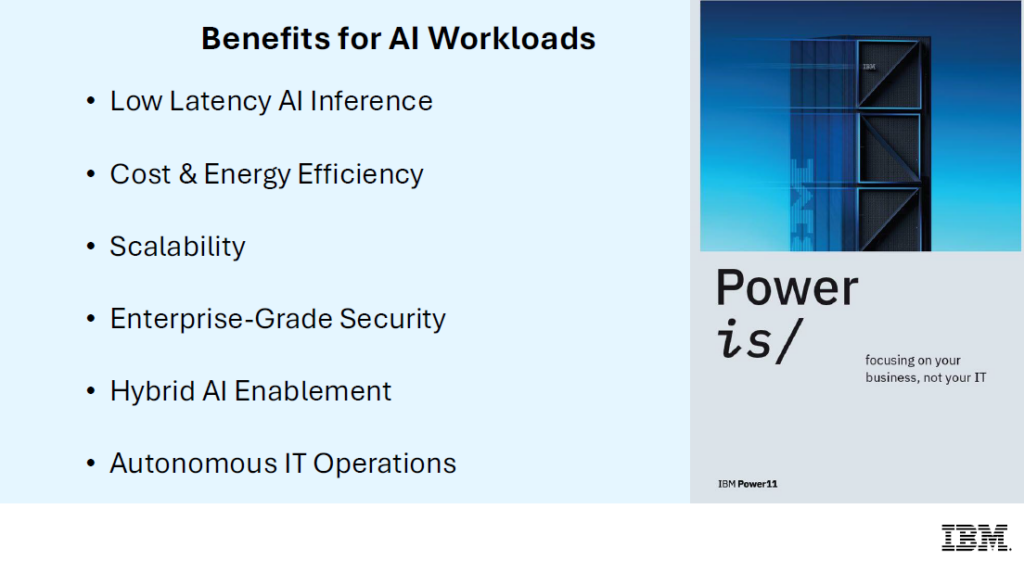 The platform guarantees 99.9999% availability, high security, and advanced RAS to minimize errors and unplanned downtime. In AI workloads, Power11 delivers up to 300 trillion operations per second (TOPS), with 32 dedicated AI cores and 128 GB of LPDDR5 memory, optimizing critical workloads.