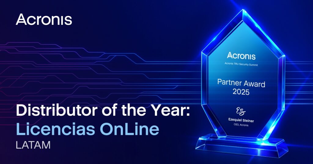 Once again, Licencias OnLine was awarded by Acronis. This recognition highlights the commitment, innovation, and collaborative work between Licencias OnLine and Acronis at a regional level, reflecting the solid growth and contribution of the company to the success of the partner ecosystem in Latin America.