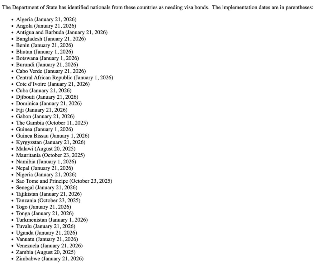 The original list of 13 countries announced in August 2025 has since been expanded by 25 more, bringing the total to 38. The full list, which includes four Caribbean nations, now also spans Bangladesh, Bhutan, Nepal, Kyrgyzstan, Tajikistan, Turkmenistan, Fiji, Tonga, Tuvalu, Vanuatu and 24 African countries.